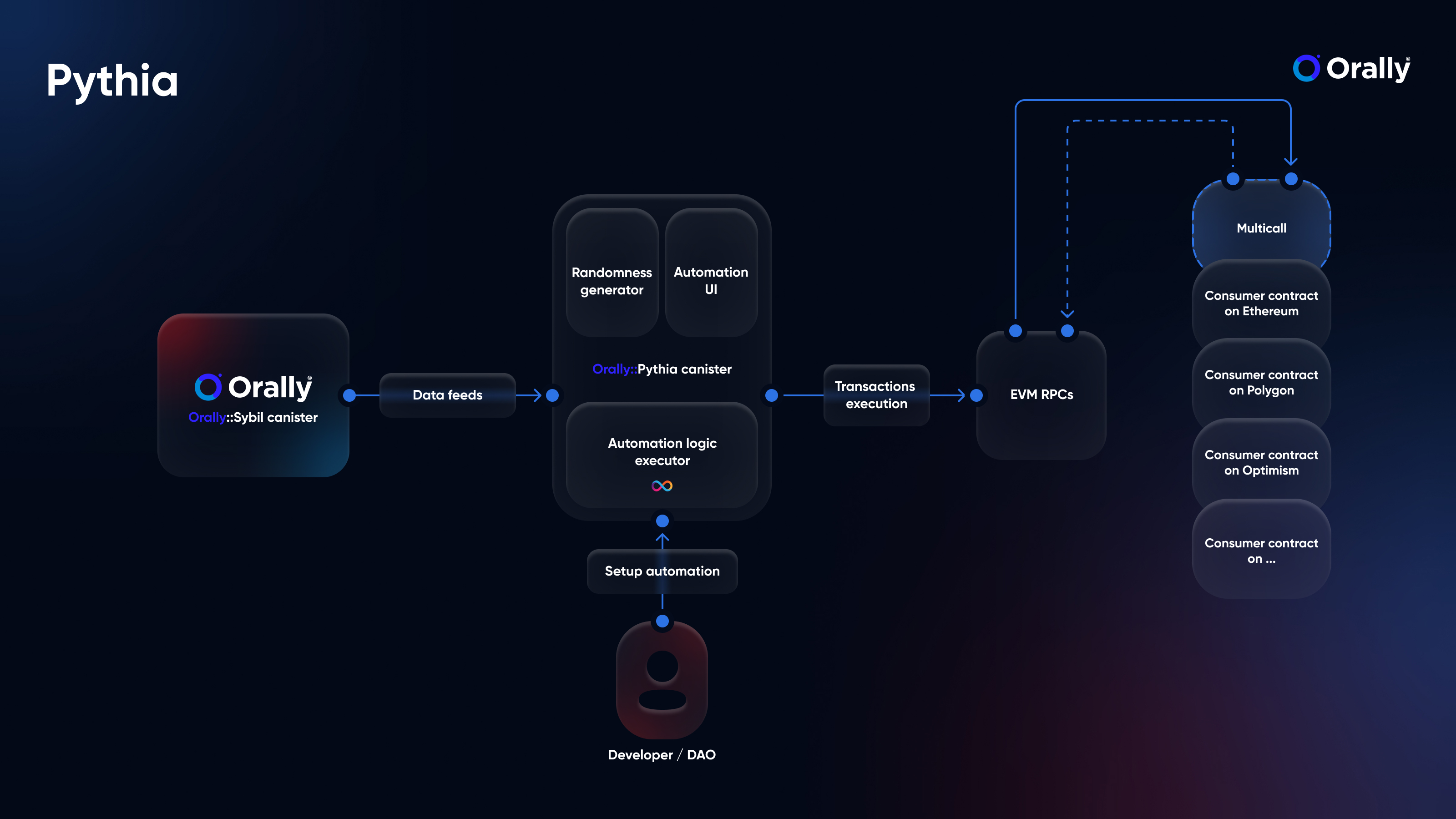 **Pythia** is the embodiment of automation and precision. It allows the scheduling of transactions or the triggering of smart contract functions based on time or data parameters. With Pythia, dApps can automate processes, optimize resource allocation, and respond promptly to market conditions or pre-defined triggers.
