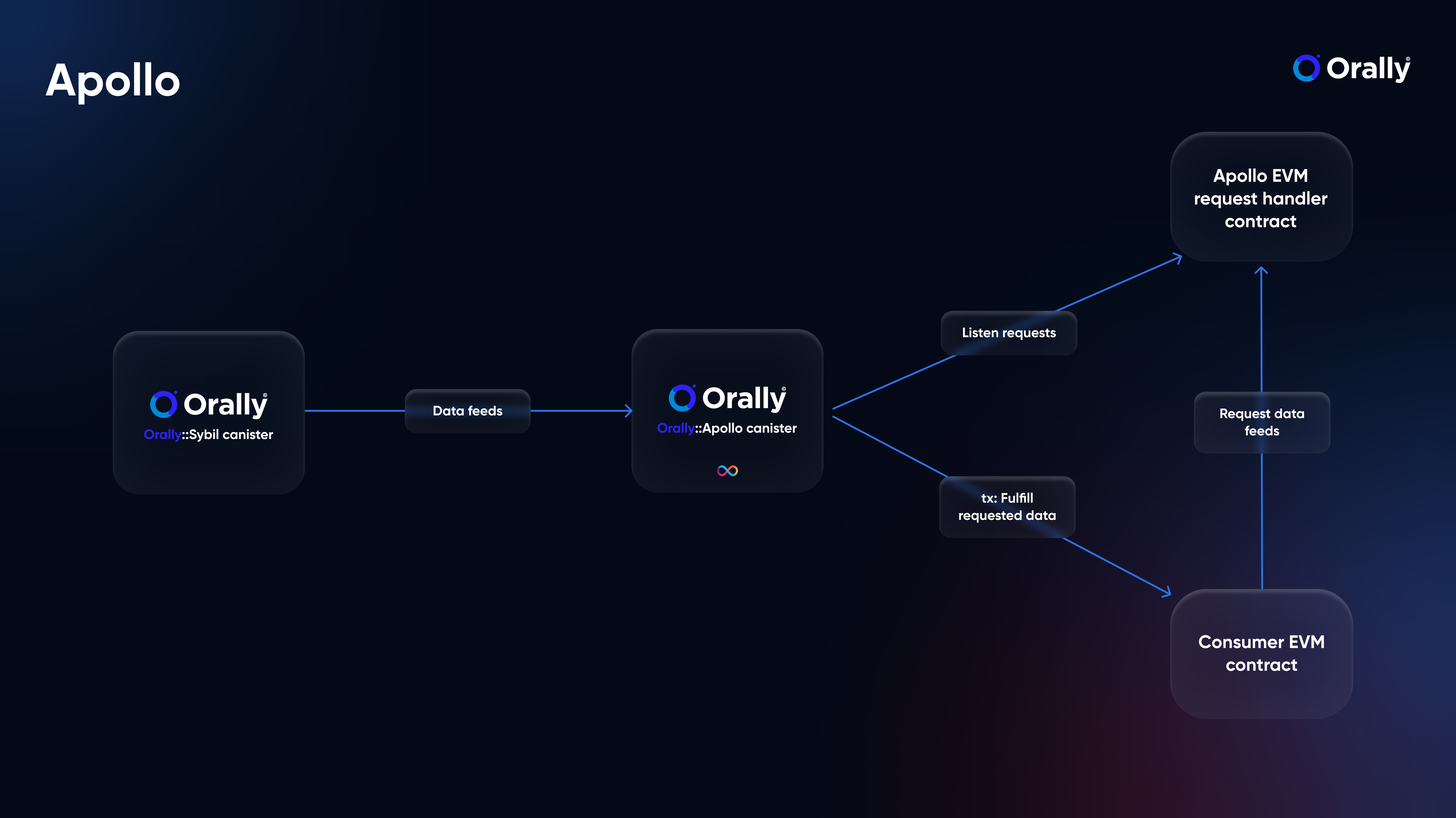 Apollo is an intricate module developed to bridge the gap between EVM (Ethereum Virtual Machine) contracts and the data-rich environment of the Orally platform, particularly its Sybil component. Beyond mere data provisioning, Apollo is also configured to provide a level of randomness through a cryptographic measure, utilizing the unpredictable BLS signatures inherent to the Internet Computer (ICP) execution layer.